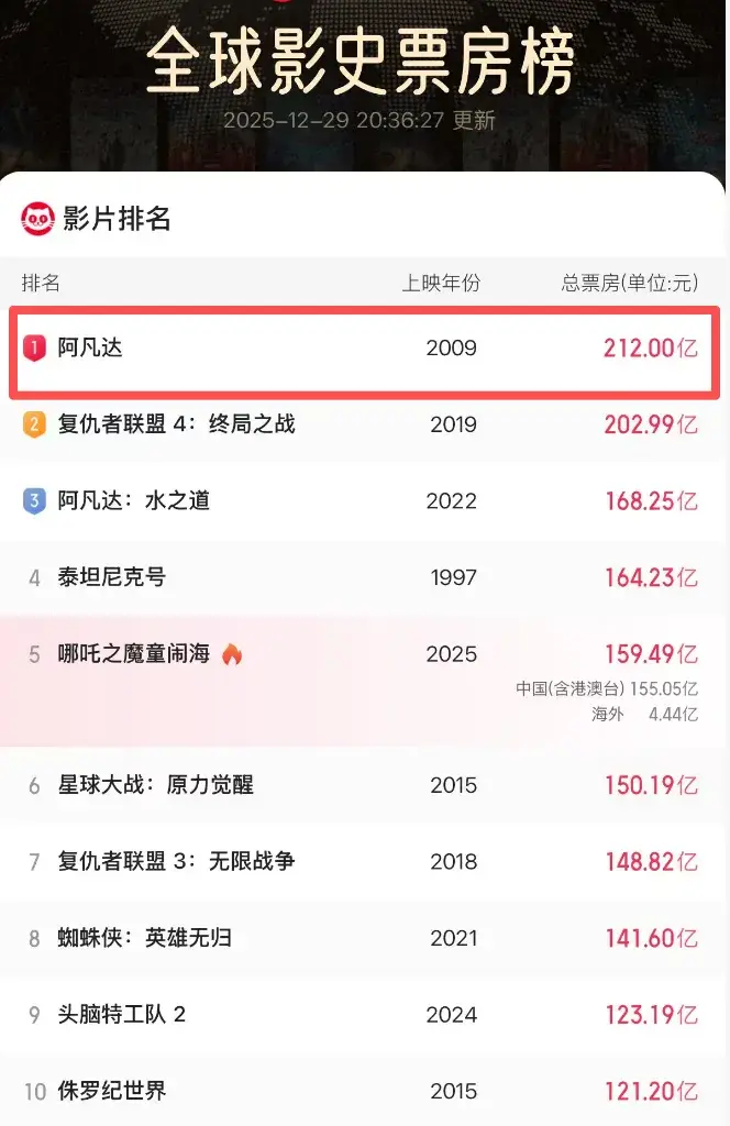 这还不是最重要的,除了排在影史第二名的《复仇者联盟》和排在第五名的《哪吒2》之外,剩下的三部电影都是卡梅隆的电影。