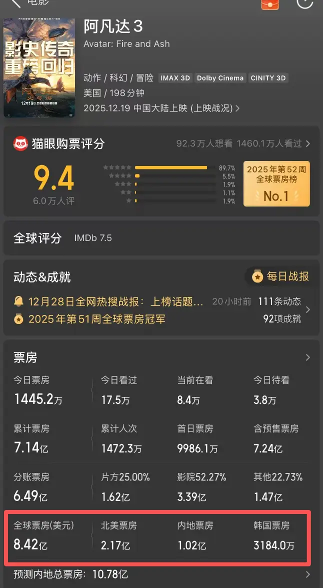 不过,《阿凡达3》的票房主要还是来自于北美地区。