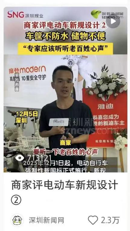 2025年12月,电动自行车强制性国标正式施行,市民与商家对新规设计的讨论日益升温。